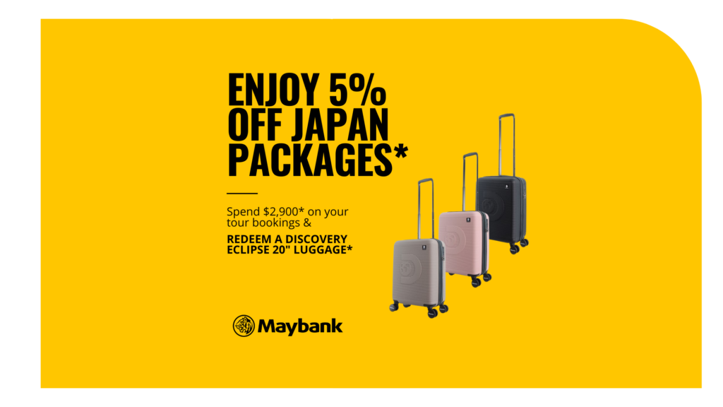 Enjoy 5% off Japan Self-Drive & Private Tour packages with Maybank cards. Spend $2,900 & redeem a Discovery Eclipse 20″ luggage.