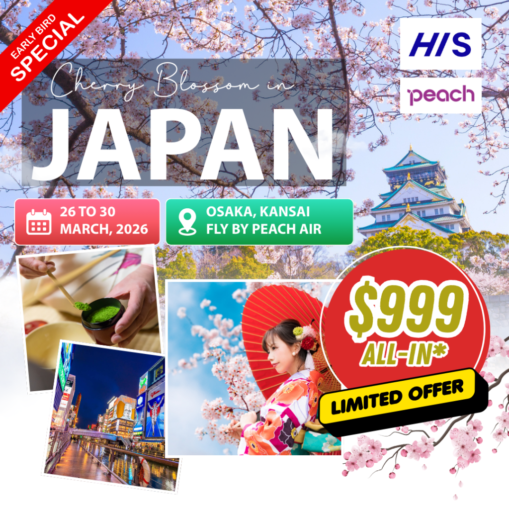 Celebrate Japan’s beauty with HIS Sakura Fair! From 1 Nov to 1 Dec, enjoy S$100 off per person on self-drive packages and win travel perks like lounge access, SIM cards, and more.